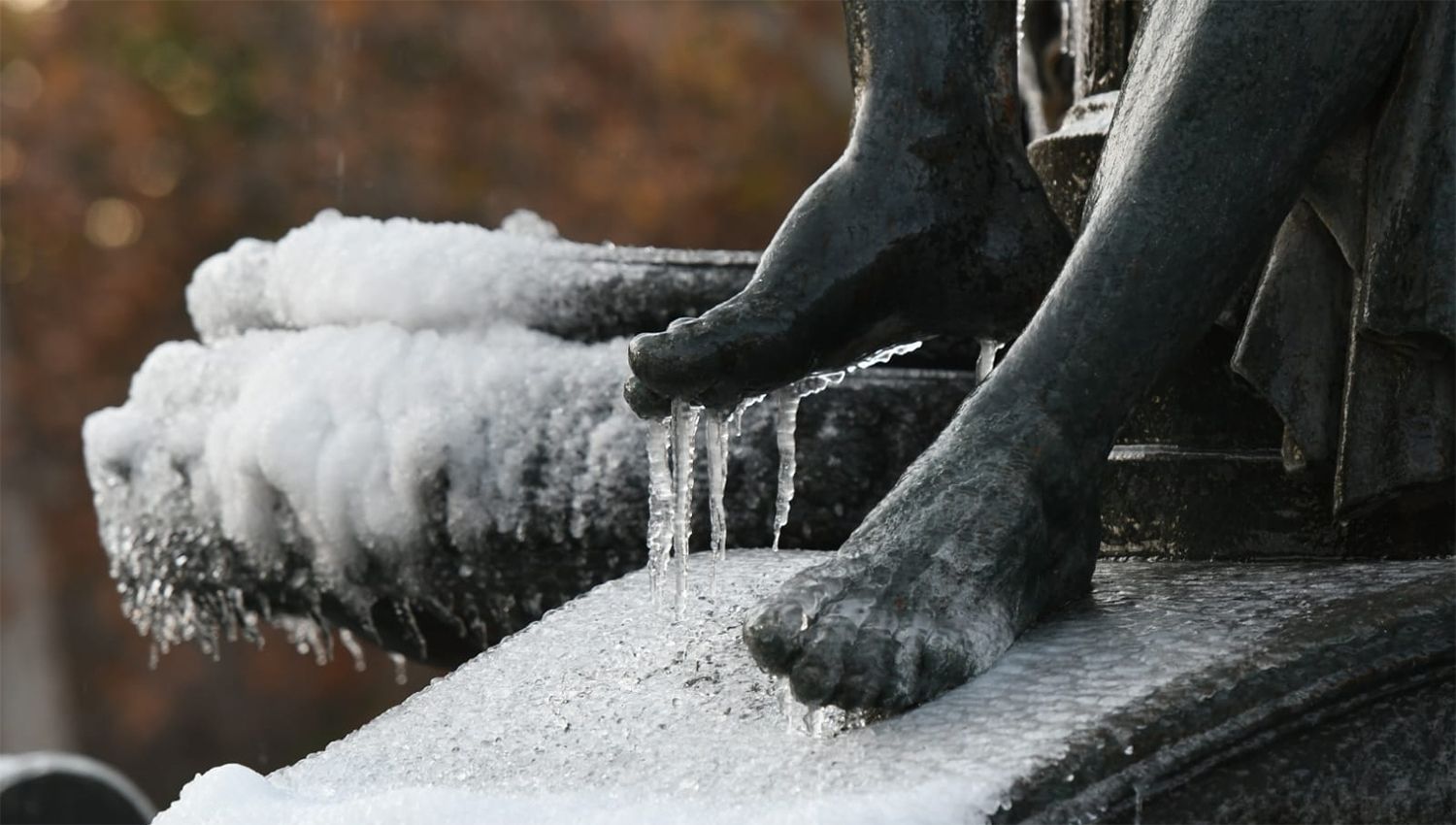 La fuente de la Plaza Independencia también sufrió los efectos de las gélidas temperaturas.