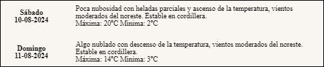 “Poca nubosidad, con heladas parciales y ascenso de la temperatura, vientos moderados del noreste”. Además, estará estable en cordillera.