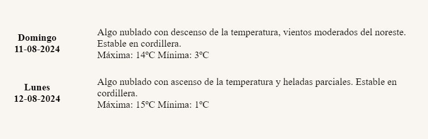 "Algo nublado con descenso de la temperatura, vientos moderados del noreste", destaca la web oficial del Gobierno de la provincia. Al tiempo que aclara que estará "estable en cordillera".