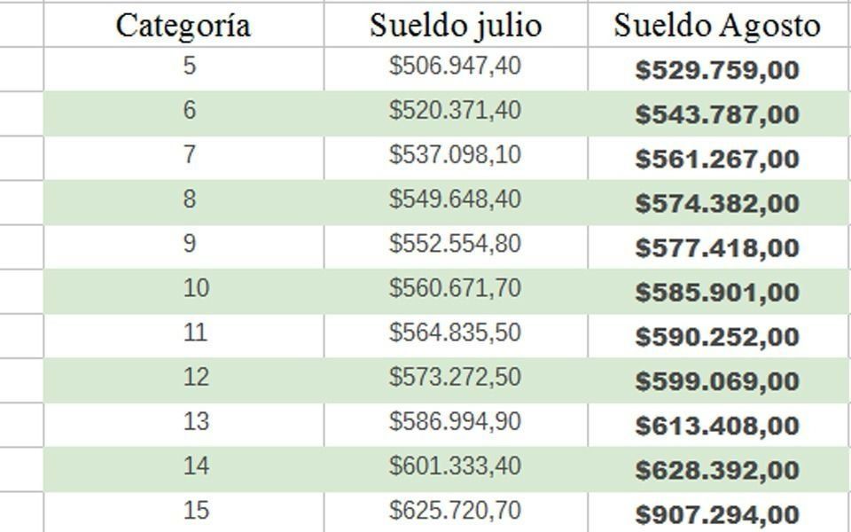 Con el aumento del 4,5% de agosto un maestro de grado de jornada simple cobrará $500.045, mientras que el sueldo de un maestro de grado de jornada completa será de $1.000.098. Como si fuera una función en continuado, tras la paritaria docente, recibieron a los gremios estatales para hacerles la misma propuesta, que a diferencia de los maestros fue aceptada de manera inmediata.