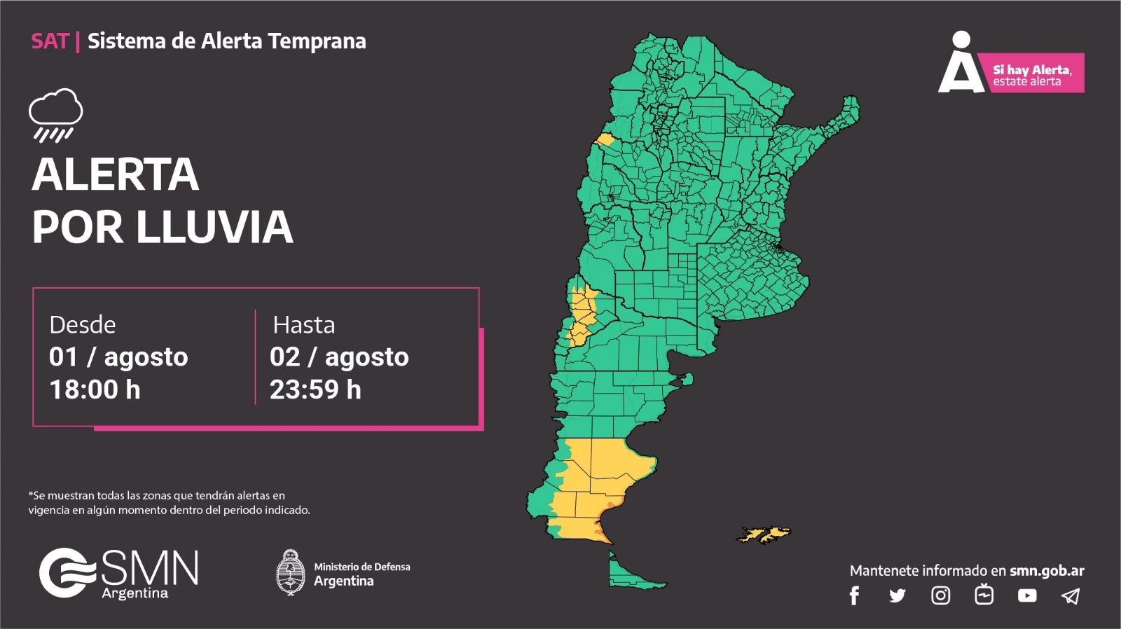 Finalmente, hay alerta por lluvia en Santa Cruz, Neuquén, y un pequeño sector de La Rioja.