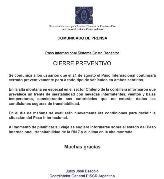Se recomienda a quienes tengan planificado viajar, mantenerse informados sobre el estado del Paso Internacional, la transitabilidad de la Ruta Nacional 7 y las condiciones meteorológicas en alta montaña.