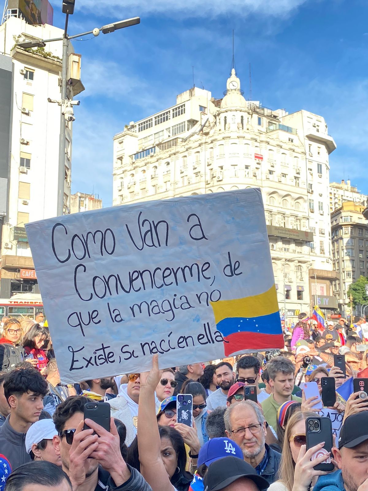 "Como van a convencerme de que la magia no existe, si nací en ella", se podía leer en uno de los mensajes sobre Venezuela. "Afuera todas las dictaduras. Si se puede. Hasta el final", decía otro cartel que también reclamaba elecciones libres y respeto a los Derechos Humanos.