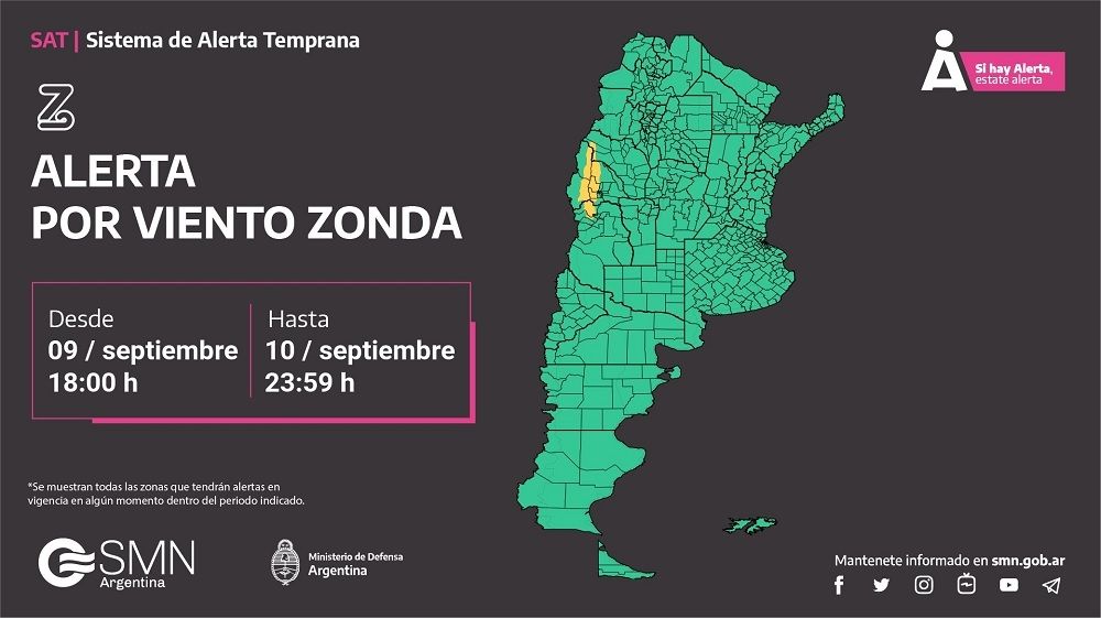 Entre las advertencias para este martes, hay alerta por Zonda en el norte de Mendoza, San Juan y podría afectar algunos sectores de La Rioja.