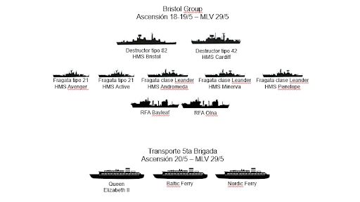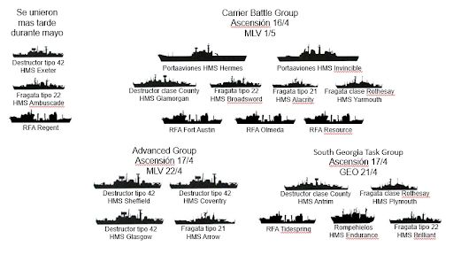 Hasta nuestros días se sigue leyendo y escuchando en los distintos relatos hablar de “La Flota” como si hubiera sido una unidad compacta. Se sabe que estaba formada por más de 100 unidades de superficie de distintos tipos, y 5 submarinos, 4 de ellos propulsados por energía nuclear. Sin embargo, dicha flota no se movió como un bloque, y fue llegando a la zona del conflicto en distintos grupos.