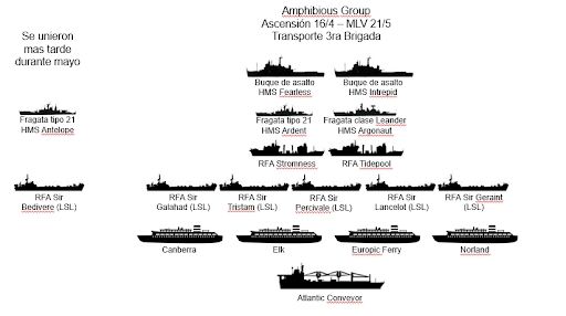 Varios días después, alrededor del 15 de mayo (la guerra, con acciones bélicas comenzó el 1 de mayo), arribó a la zona el segundo gran grupo de embarcaciones, el Amphibious Group, que como su nombre lo indica, transportaba a las tropas de la 3ra brigada que desembarcarían en la Bahía de San Carlos. Estaba compuesto principalmente por buques de transporte de tropas (5) y sus fragatas protectoras (3), buques de desembarco (6), y dos naves de asalto anfibio, el HMS Fearless y el HMS Intrepid, unidades claves para llevar a cabo el desembarco de tropas que comenzaría el 21 de mayo y se prolongaría durante unos 7 días.