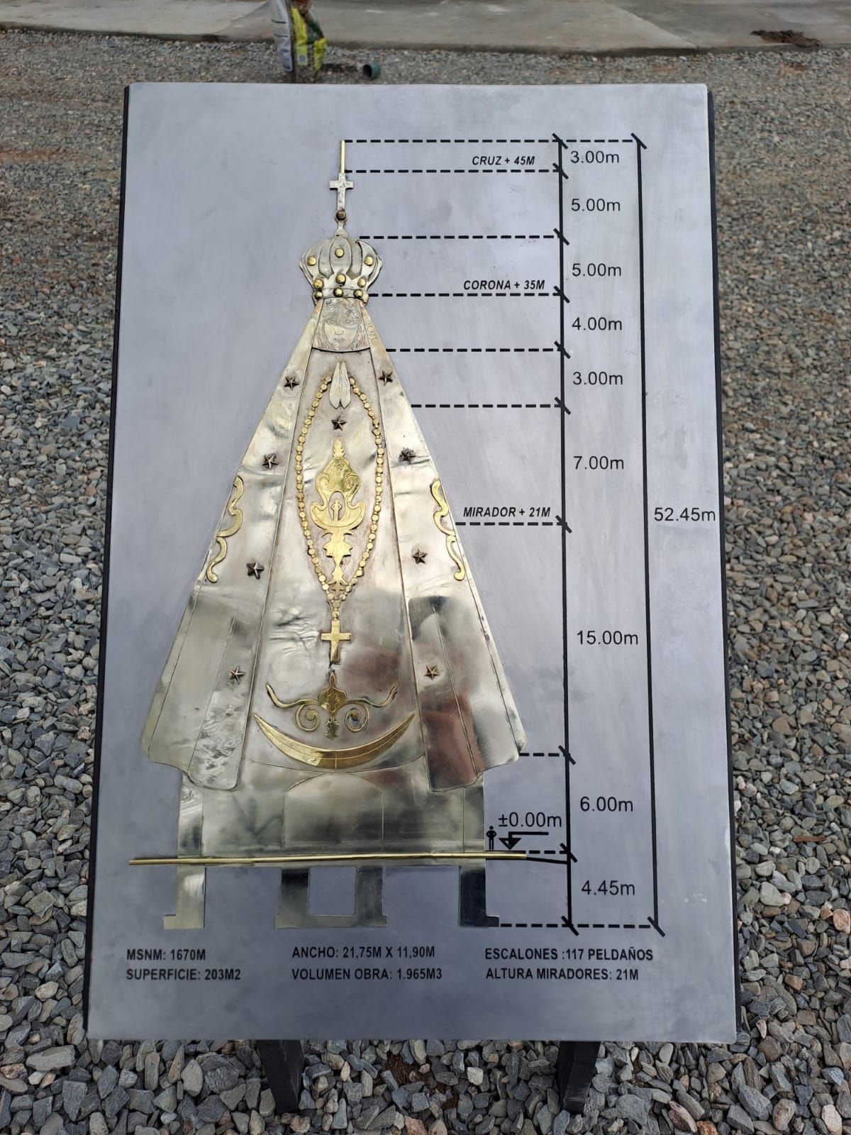 Inicialmente, la idea era hacer una figura de no más de 25 o 30 metros, para que tome relevancia y protagonismo. Una vez abierto el camino, se avanzó con el proyecto, pero después de dos años, se hizo un cambio y reformulación debido a que lo que se había construido no cumplía con la visión original. “La estructura de hormigón ya estaba hecha, pero tuvimos que rediseñar el proyecto y agrandar la imagen. Nos dimos cuenta de las dimensiones finales tras muchas pruebas y errores”, explica Walter.