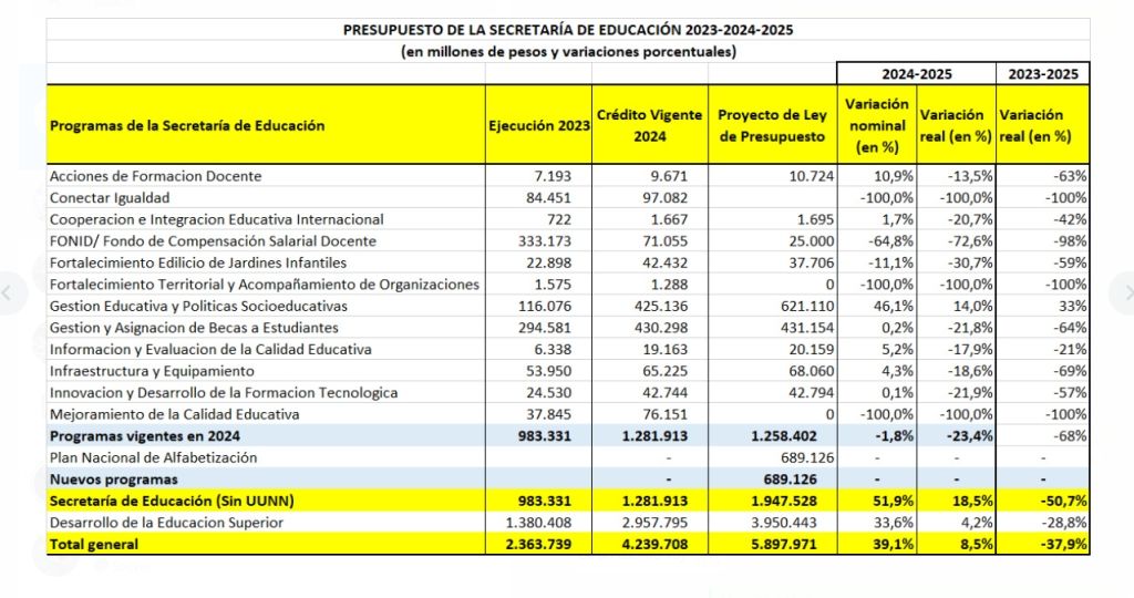 "El Proyecto de Presupuesto 2025 presentado por Javier Milei, representa un nuevo ataque a la educación pública y vulnera el derecho a la educación que tiene que estar garantizado para toda la ciudadanía en nuestro país", afirmaron desde el gremio. "Todos los ítems del presupuesto se ven afectados, especialmente el Plan Conectar Igualdad, el fortalecimiento territorial y el Mejoramiento de la calidad educativa, que directamente desaparecen del presupuesto 2025. A su vez, también se ven seriamente afectadas las Acciones de Formación Docente (-63%), la construcción de Jardines de Infantes (-59%), las Becas estudiantiles (-64%), la Infraestructura y el equipamiento (-69%), entre otras", puntualizaron.