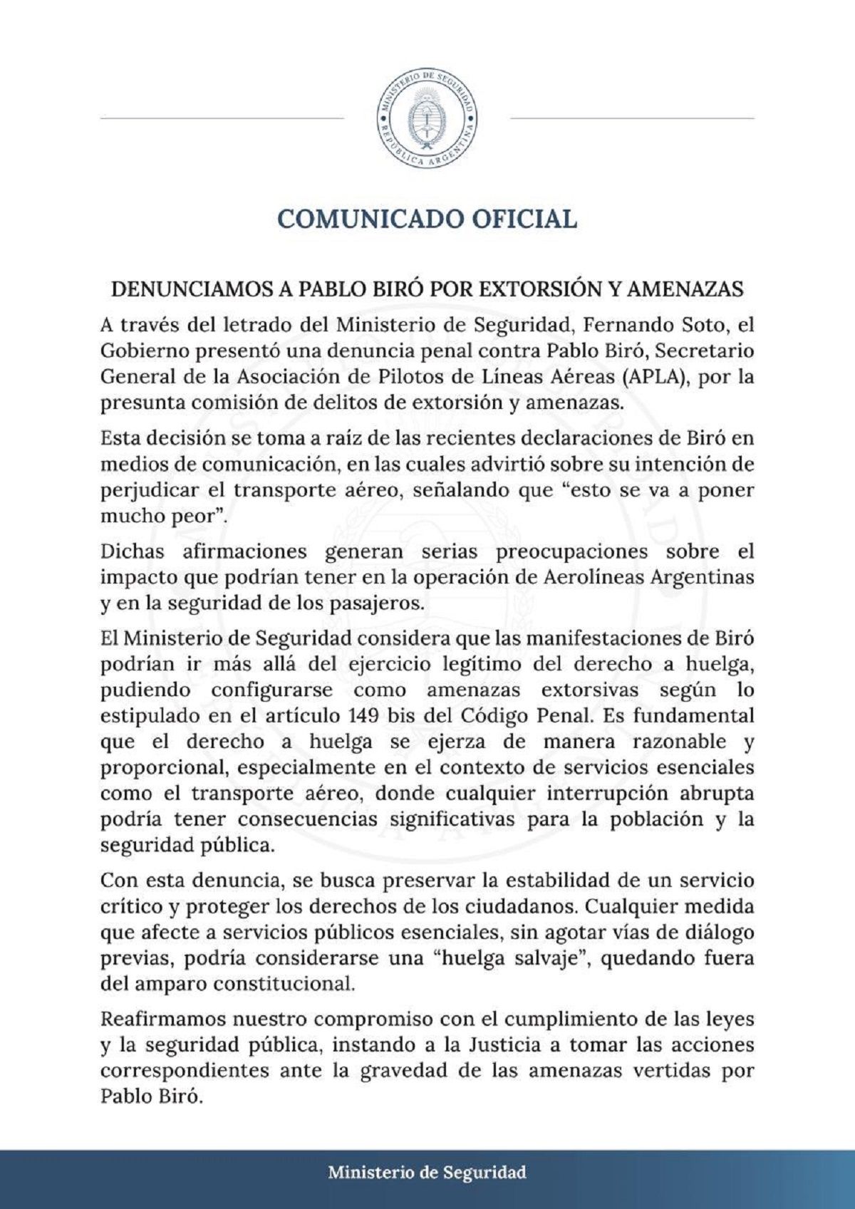 Según un comunicado que difundió el Ministerio de Seguridad, las acciones y declaraciones de Pablo Biró "podrían exceder el derecho de huelga amparado por la Constitución Nacional y constituir un acto ilícito bajo la figura del delito de amenazas extorsivas". Dicha figura está contemplada en el artículo 149 bis del Código Penal.