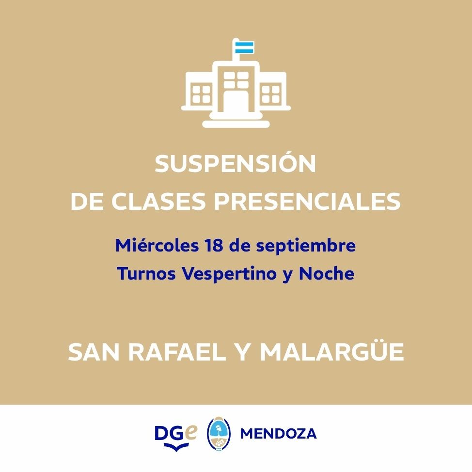 Por su parte, este miércoles la Dirección General de Escuelas confirmó que se suspenden las clases en los turnos tarde y noche en todos los colegios del departamento de San Rafael y del departamento de Malargüe.