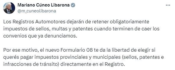 Esta mañana, el ministro de Justicia de la Nación, Mariano Cúneo Libarona, anunció la creación de un nuevo formulario 08 (Contrato de transferencia e inscripción de dominio) que les permite a los propietarios de vehículos elegir si desean o no pagar impuestos provinciales y municipales en el registro.
