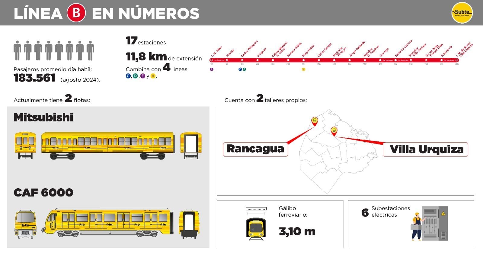 Por día, la línea B transporta 183 mil pasajeros entre las estaciones Leandro N. Alem, en Puerto Madero, y Juan Manuel de Rosas, en pleno Villa Urquiza, pasando por centros de trasbordo neurálgicos como Chacarita y la zona del Obelisco. Estas nuevas formaciones reemplazarán a los históricos coches Mitsubishi, que tienen en promedio 60 años, y los CAF 6000, que tienen más de 20 años.