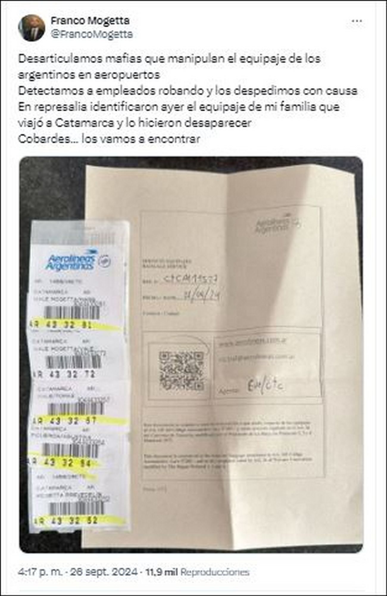 En su red social X, Mogetta comentó: "Detectamos a empleados robando y los despedimos con causa. En represalia identificaron ayer el equipaje de mi familia que viajó a Catamarca y lo hicieron desaparecer. Cobardes... los vamos a encontrar", advirtió en su mensaje que acompañó con una foto de la denuncia realizada y los comprobantes de número de las valijas desaparecidas.