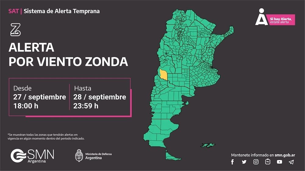 El Servicio Meteorológico Nacional y la dirección de Defensa Civil de Mendoza emitieron alertas simultáneas para este sábado ante la posibilidad de ráfagas de viento Zonda en distintos sectores de la provincia.