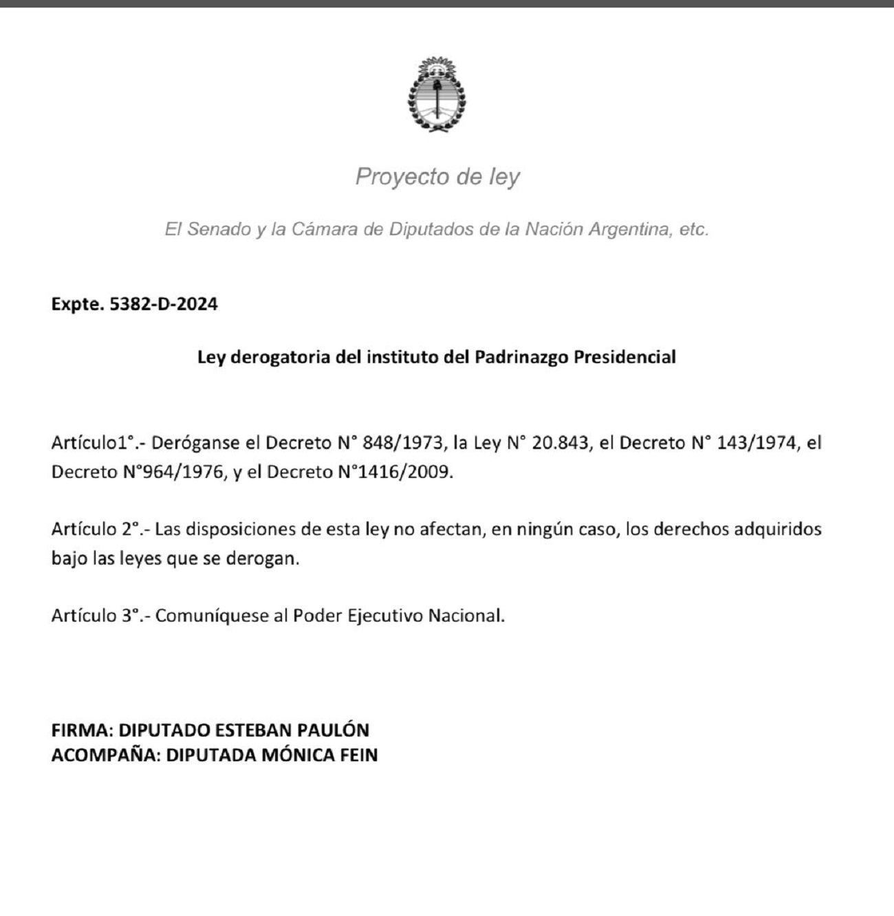 "Presentamos un proyecto para eliminar el instituto del 'padrinazgo o madrinazgo' presidencial al séptimo hijo o hija de cada familia Una sociedad plural y moderna no admite distinciones de ningún tipo", indicó Pauló en un posteo que compartió en X. Y adjuntó el siguiente proyecto: