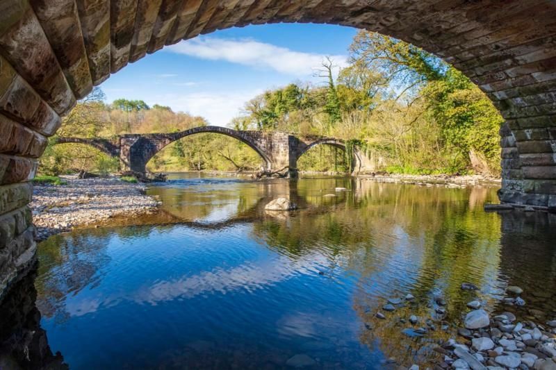 A continuación, serpentea durante unos 11 kilómetros a través de ondulantes tierras de cultivo, pasando por los grandes edificios del Stonyhurst College y por monumentos históricos como el puente de Cromwell, un puente para caballos de carga cubierto de vegetación que alguna vez utilizó Oliver Cromwell en la guerra civil inglesa.