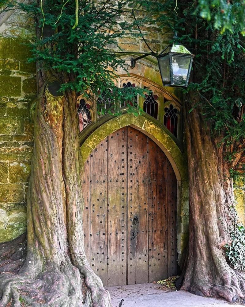 Su dibujo, aunque estilizado, es casi idéntico a la puerta norte de la iglesia de San Eduardo, desde los árboles que marcan la entrada hasta la lámpara que cuelga sobre ella, lo que dio lugar al rumor de larga data de que fue allí donde encontró la inspiración para sus míticas puertas de montaña.