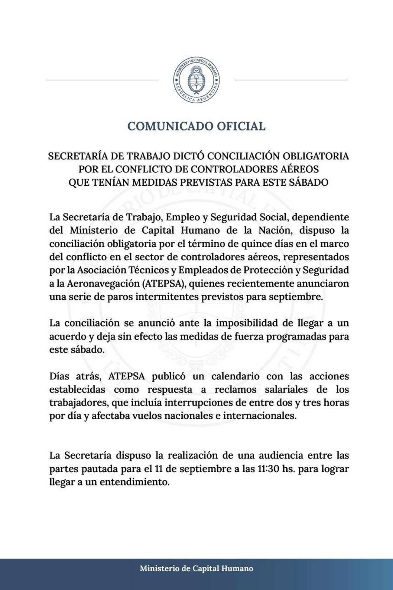 La Secretaría de Trabajo, Empleo y Seguridad Social, dependiente del Ministerio de Capital Humano de la Nación, dispuso en la tarde de este jueves la conciliación obligatoria por el término de 15 días en el marco del conflicto en el sector de controladores aéreos, representados por la Asociación Técnicos y Empleados de Protección y Seguridad a la Aeronavegación (ATEPSA), quienes recientemente anunciaron una serie de paros intermitentes durante el mes de septiembre.