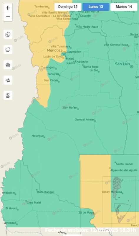 Por su parte, el Servicio Meteorológico Nacional emitió un alerta amarilla por tormentas en todo el sector cordillerano del Valle de Uco, Luján Las Heras y algunos sectores de Lavalle. También una alerta amarilla por temperaturas extremas para toda la provincia excluyendo a Malargüe.