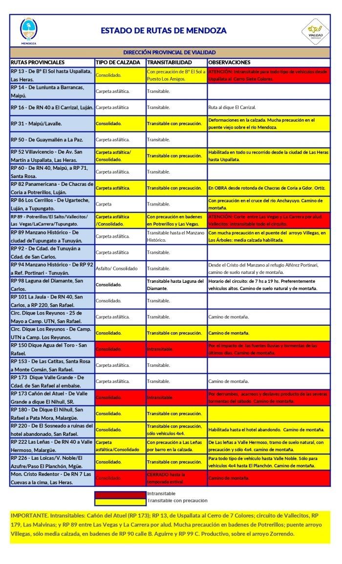 La que quedó habilitada con precaución fue la RP 13 entre Uspallata y el Cerro Siete Colores.