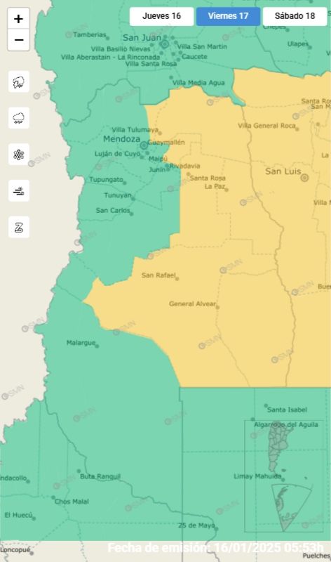 Las precipitaciones comenzarán alrededor de las 20:00 y afectarán a gran parte de la provincia. En departamentos como General Alvear, San Rafael, Las Heras, La Paz, Lavalle, San Martín y Santa Rosa, las tormentas serán más intensas, lo que motivó la emisión de una alerta amarilla por parte del SMN.