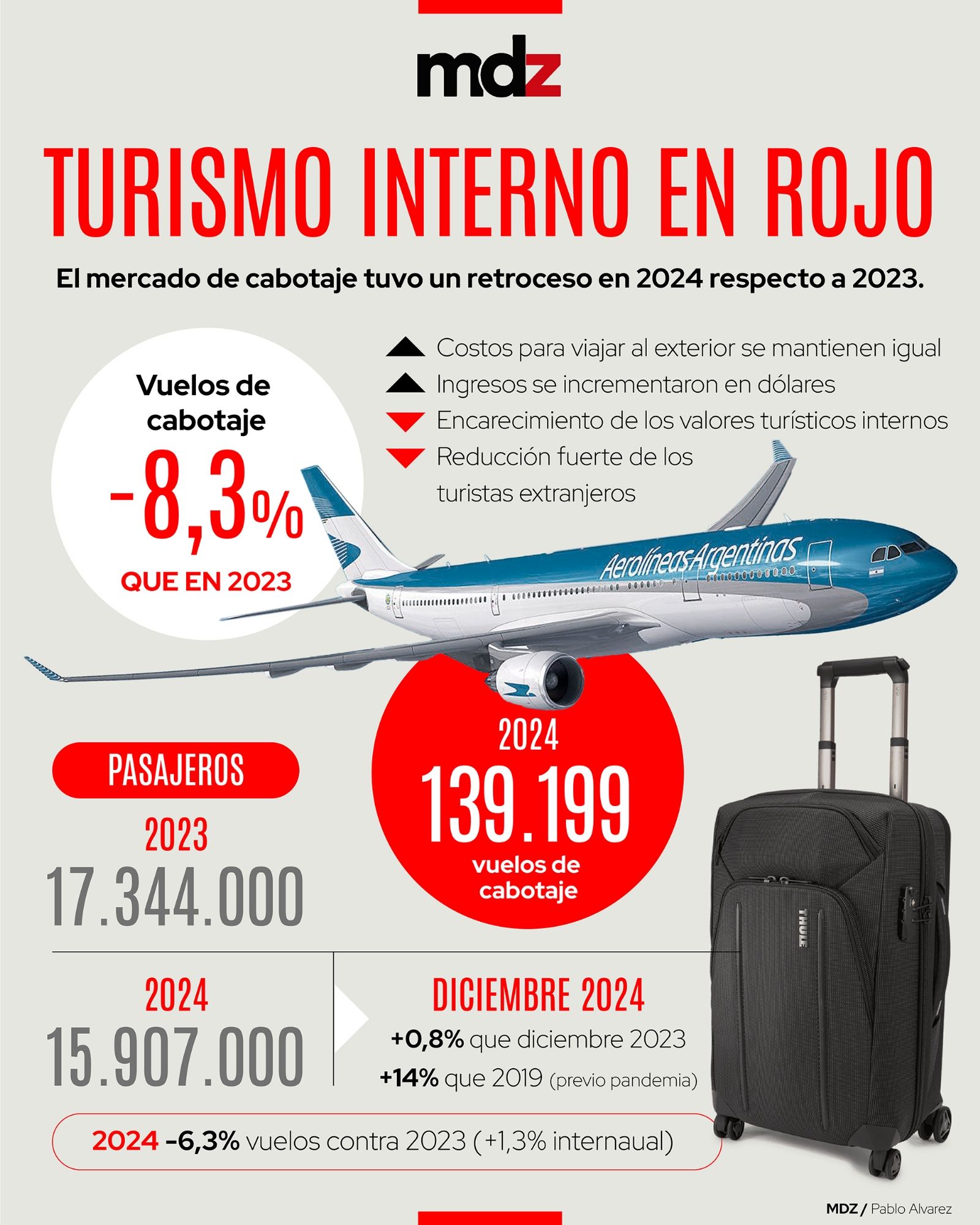 Medido en cantidad de vuelos, el 2024 tuvo una caída de 6,3% contra 2023 y una suba de 1,3% en la comparación internaual con diciembre de aquel año. En total, el año pasado, se realizaron 139.199 vuelos de cabotaje.
