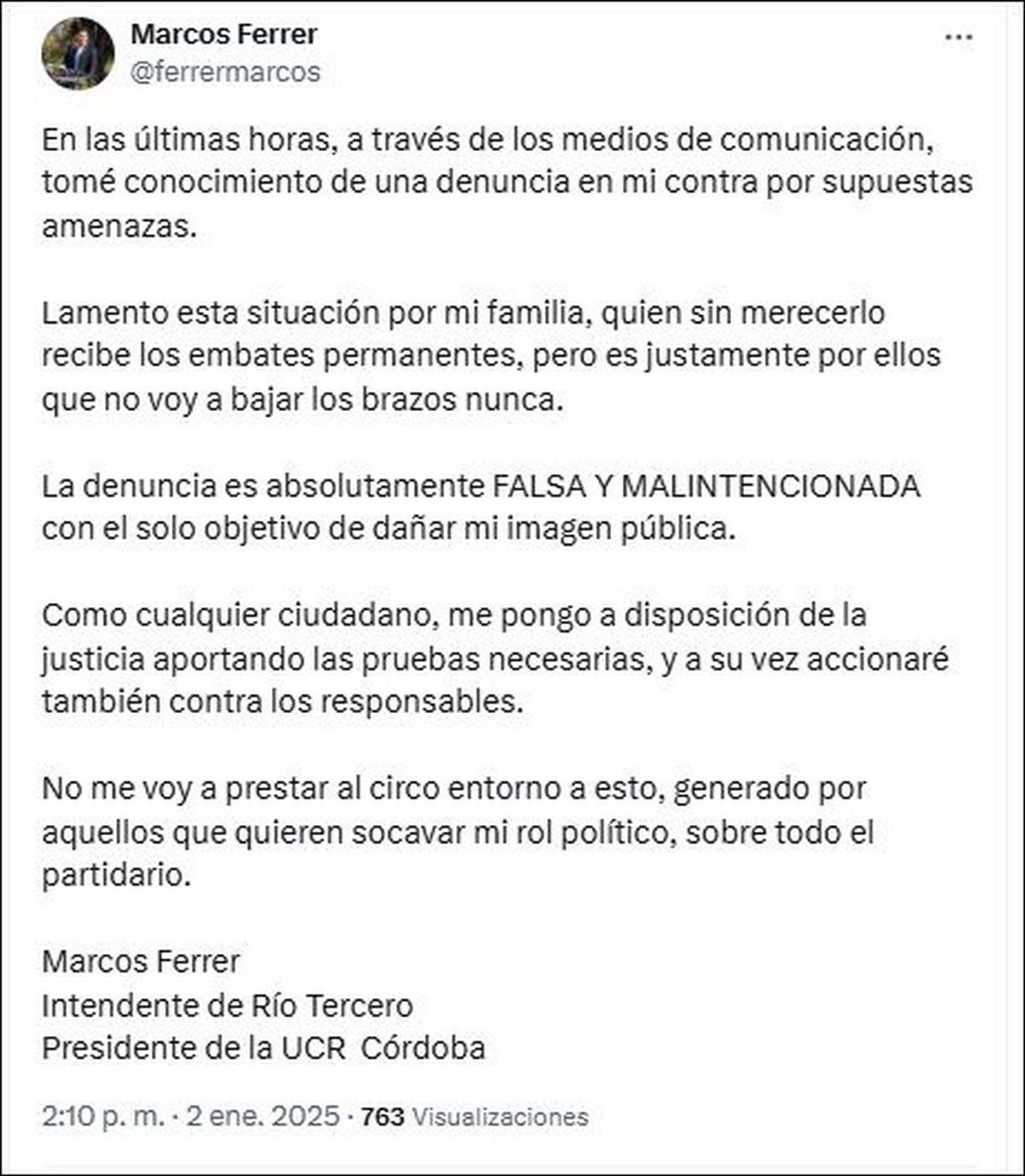 Ante el escándalo que generó la denuncia del periodista, Marcos Ferrer respondió a las acusaciones a través de sus redes sociales, calificándolas como “falsas y malintencionadas”. En su mensaje, aseguró que buscan dañar su imagen pública y su rol político. “No voy a bajar los brazos por mi familia ni a prestarme a este circo”, expresó, añadiendo que se pondrá a disposición de la justicia y emprenderá acciones legales contra los responsables de la denuncia.