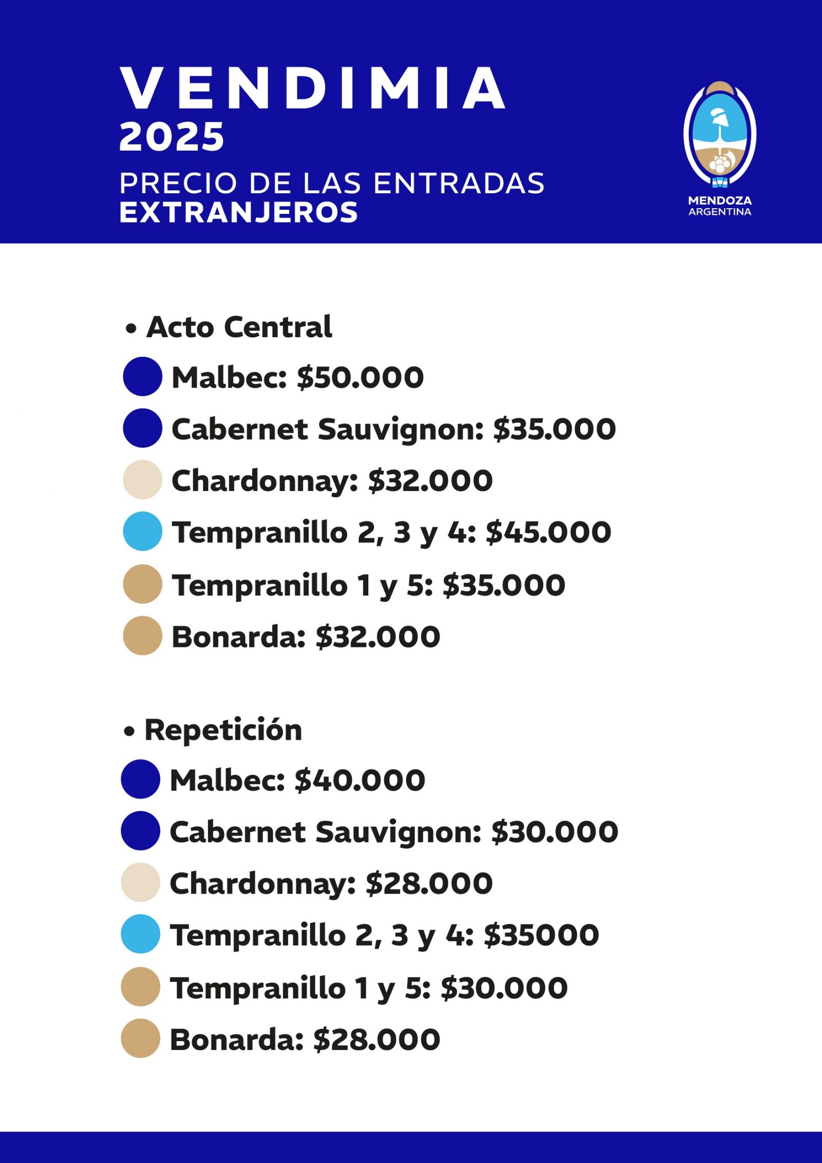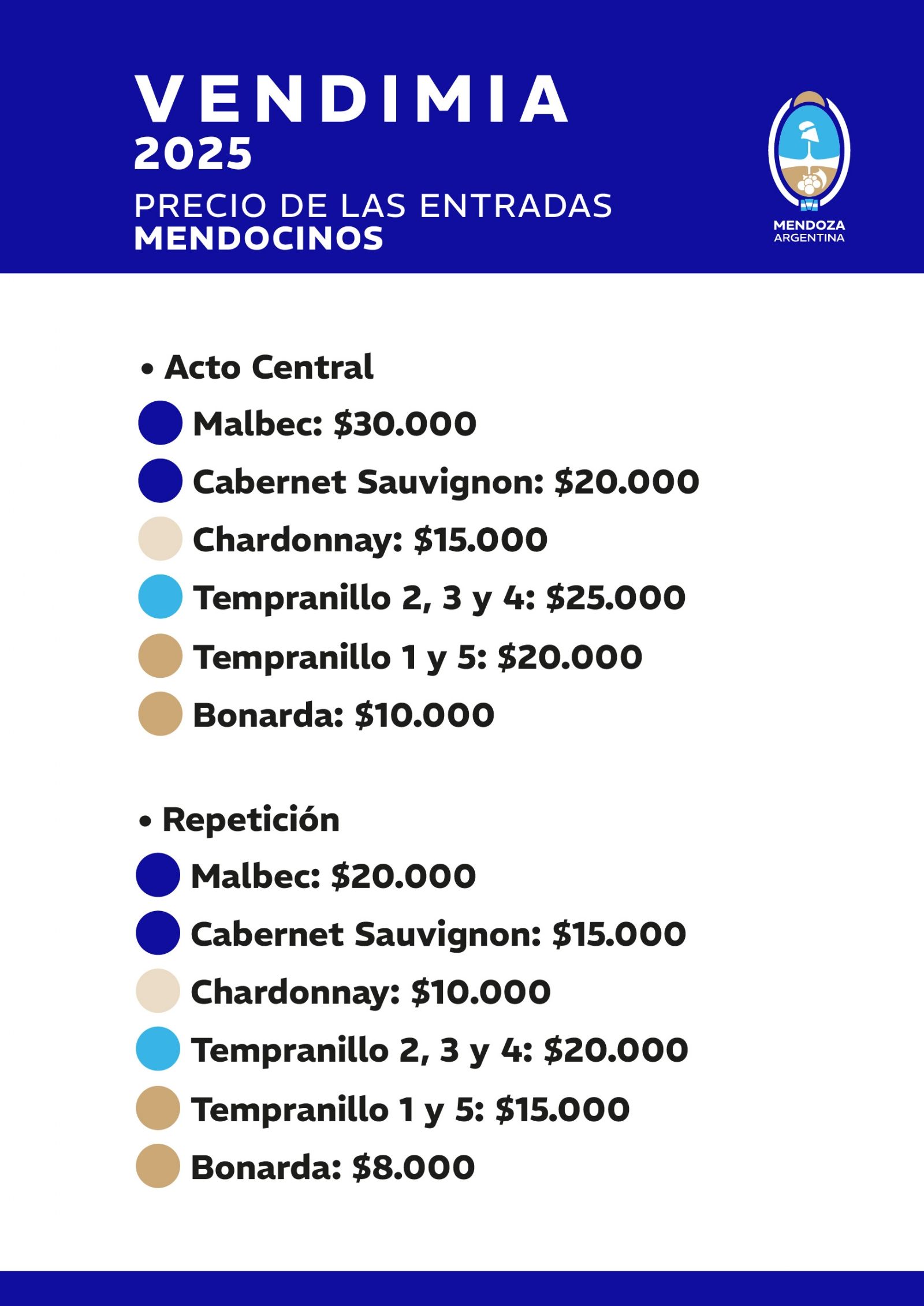 Las entradas estarán disponibles exclusivamente en la plataforma digital EntradaWeb, y cada persona podrá adquirir hasta un máximo de cuatro tickets. Los precios están diferenciados según el sector y la función elegida, con tarifas más accesibles para residentes mendocinos.