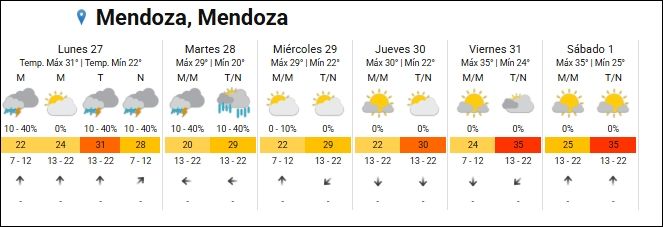 La semana comienza con un leve alivio térmico en Mendoza debido a la presencia de tormentas en todo el territorio provincial, según el pronóstico del Servicio Meteorológico Nacional. En el Gran Mendoza, la temperatura máxima alcanzará los 31°, mientras que la mínima será de 22°. No se han emitido alertas por temperaturas extremas.