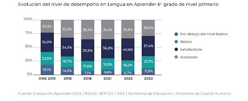 Según las pruebas Aprender 2023, que se toman a alumnos y alumnas de 6to. grado de escuelas seleccionadas de toda la Argentina, tanto privadas como públicas, el 11,9% de los niños tienen un nivel por debajo del básico en lo que concierne a los aprendizajes lingüísticos, y un 21,7% tiene un nivel básico. Si comparamos los resultados de 2023 con los de 2018, 2021 y 2022, vemos que estos porcentajes han crecido, lo que indica que son cada vez más los niños que tienen un nivel por debajo del básico o básico.