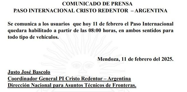 Finalmente, quedó habilitado el Paso a Chile