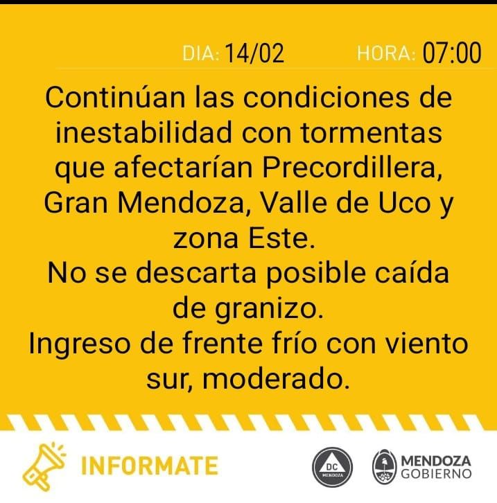 También indicaron las zonas bajo alerta son: Capital, Godoy Cruz, Guaymallén, Maipú, este de Las Heras, La Paz, Lavalle, San Martín, Santa Rosa, Junín, Rivadavia, Luján de Cuyo y el Valle de Uco.