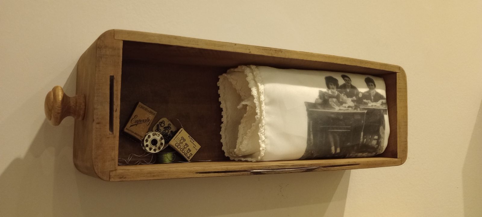 Las fotografías impresas en lienzo se repiten en otras obras de diferentes maneras, a veces protagonizando la obra como en la ya mencionada o en “Cosida a mano”, realizada de la misma forma, donde la ternura de una niña bordando junto a su muñeca, hace de contrapunto en la pared de enfrente. En cada obra el lienzo impreso con diferentes mujeres, es el hilo conductor que va indicando la sujeción de las silenciosas protagonistas al trabajo doméstico, no reconocido como tal. Como expresara la Arq. Cristina Álvarez Rodríguez (Presidenta INIHEP – Museo Evita) en su texto para esta muestra: “Con sus manos y con sus máquinas, las mujeres tejieron sueños de independencia, mientras enfrentaban las profundas desigualdades de su tiempo. Evita lo sabía y por eso todavía “máquina de coser” y su nombre se encuentran entrelazados.”