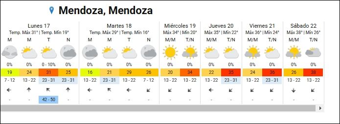 Las nulas precipitaciones se mantendrán durante la semana. En cuanto a las temperaturas, se mantendrán estables hasta el miércoles donde las máximas subirán. El miércoles se registrarán 34°, el jueves 35°, el viernes 36° y el sábado 38°.