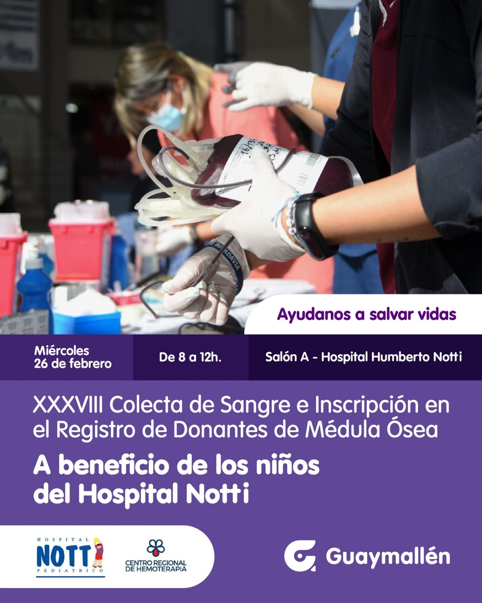 La Municipalidad de Guaymallén organizará la primera colecta de sangre del año en conjunto con el Servicio de Hemoterapia del Hospital Humberto Notti. La actividad tendrá lugar el miércoles 26 de febrero en el Salón A del nosocomio, ubicado en Bandera de los Andes 2603, de 8.00 a 12.00.