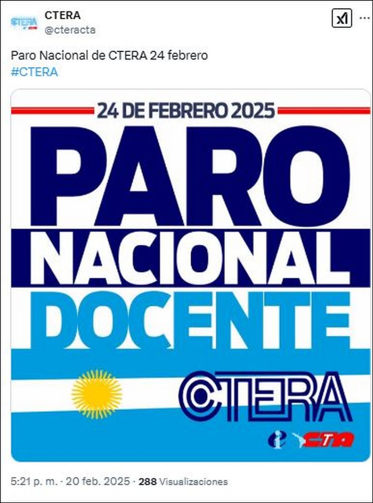 Cabe recordar que los gremios docentes afiliados a la Confederación General del Trabajo (CGT) anunciaron una medida de fuerza para el 24 de febrero y también para el 5 de marzo.