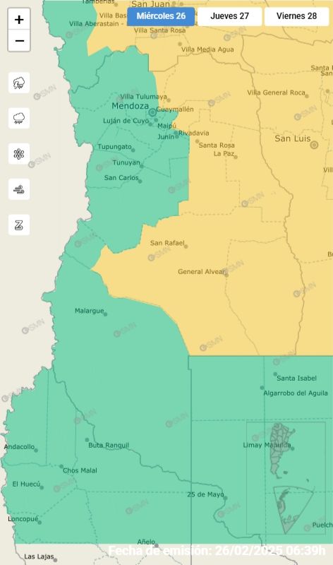 El Sistema de Alerta Temprana (SAT) del Servicio Meteorológico Nacional emitió una alerta amarilla por tormentas para la mitad de la provincia de Mendoza. Las precipitaciones se esperan para la tarde-noche de este miércoles.