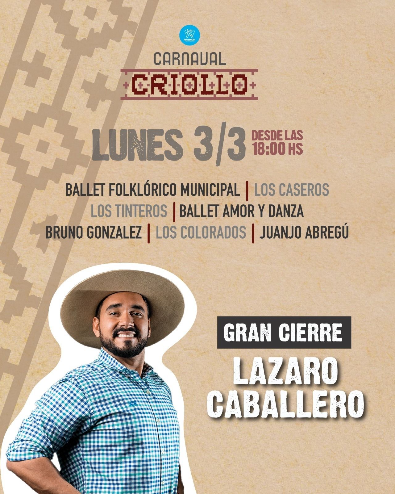 El gran cierre será el lunes 3 de marzo con la presencia especial de Lázaro Caballero y las presentaciones de Los Caseros, el Ballet Folklórico Municipal, Los Tinteros, el Ballet Amor y Danza, Bruno Gonzalez, Los Colorados y Juanjo Abregú.