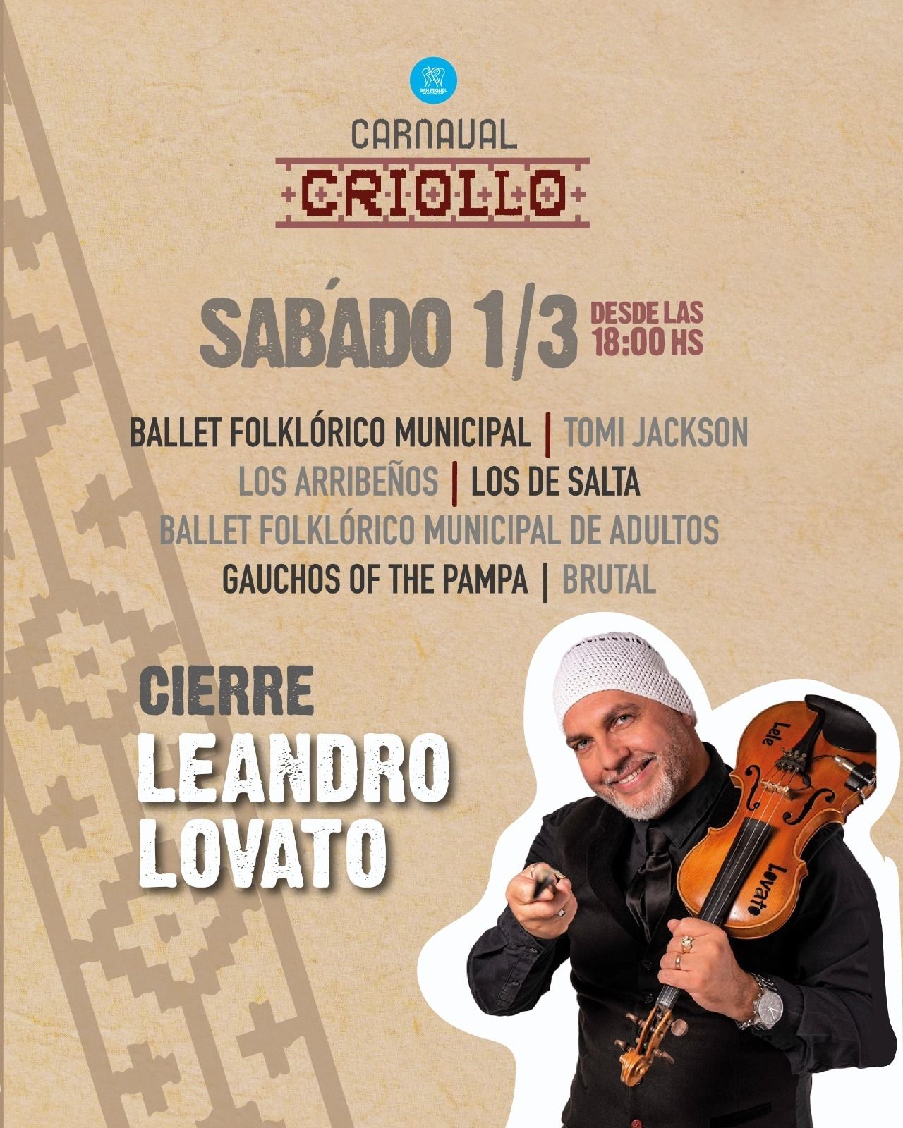 El sábado 1ro de marzo participará Leandro Lovato y se presentarán el Ballet Folklórico Municipal, Tomi Jackson, Los Arribeños, Los de Salta, el Ballet Folklórico Municipal de adultos, Gauchos of the Pampa y Brutal.