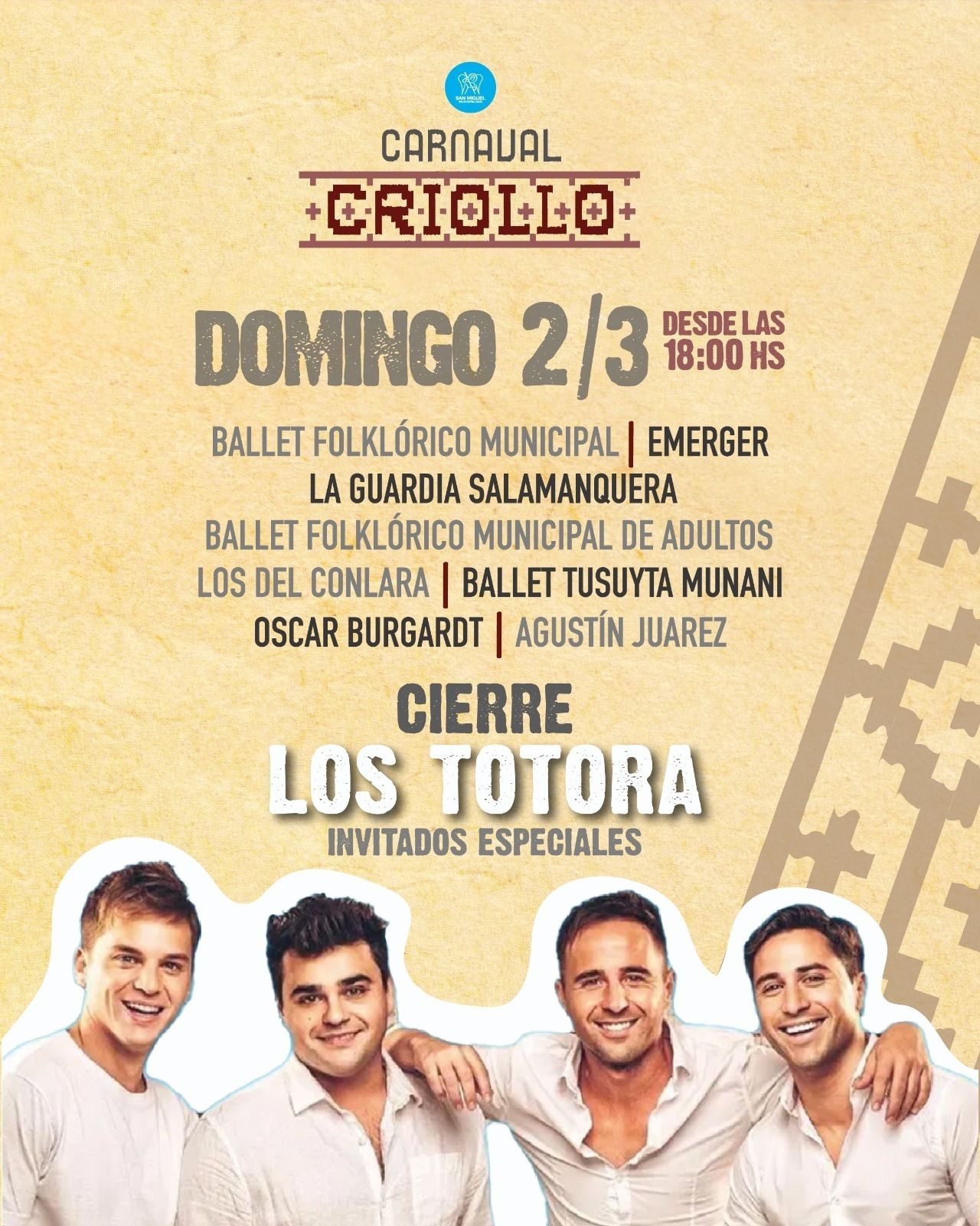 Mientras que el domingo 2 la banda destacada será la de Los Totora y también estarán el Ballet Folklórico Municipal, Emerger, La Guardia Salamanquera, Los del Conlara, el Ballet Folklórico Municipal de adultos, Oscar Burgarot, Agustín Juárez y el Ballet Tusuyta Munani.