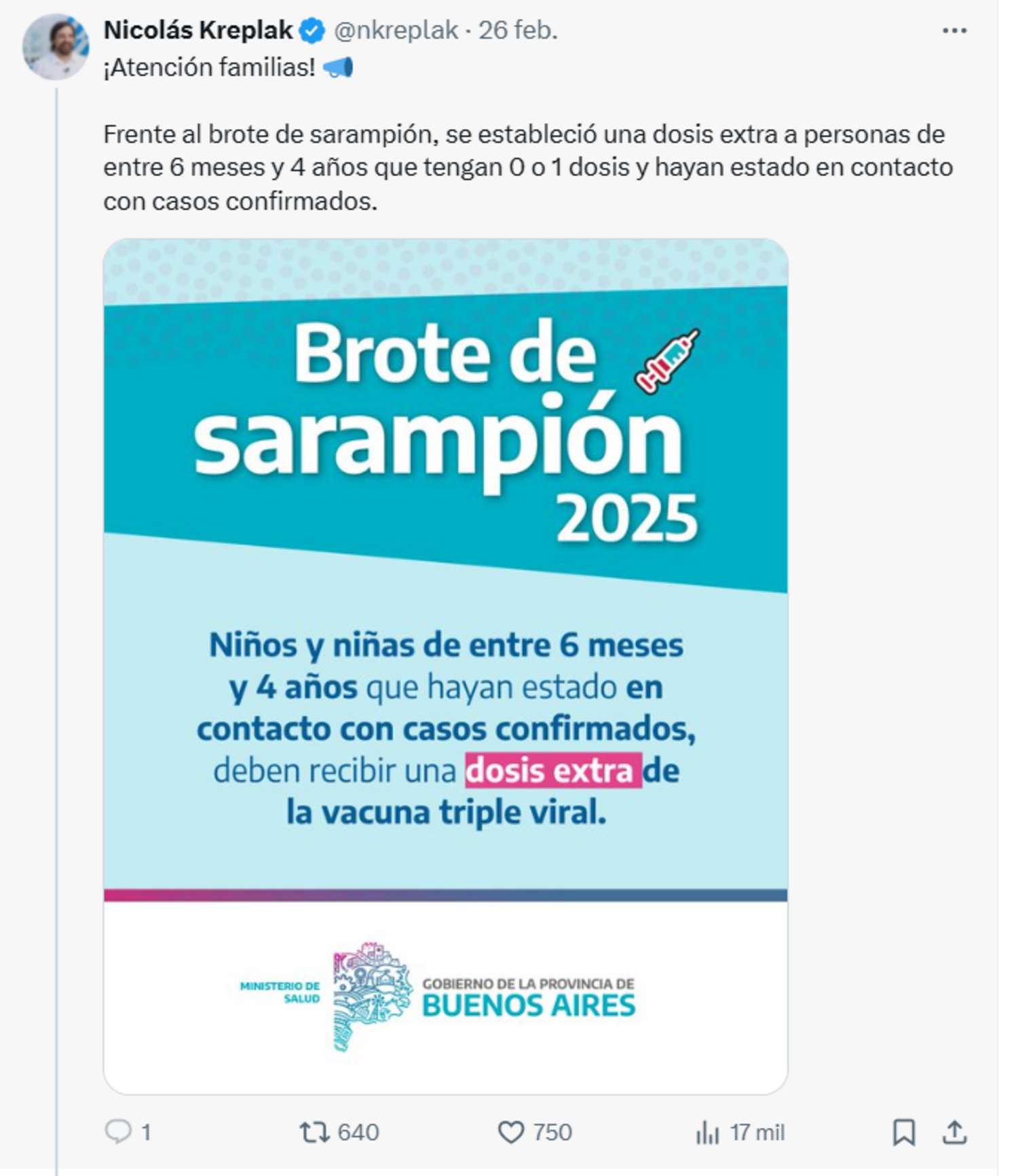 El ministro de Salud, Nicolás Kreplak, informó a través de sus redes sociales que la vacunación está destinada a personas de entre 6 meses y 4 años que tengan 0 o 1 dosis y hayan estado en contacto con casos confirmados. Kreplak también aclaró que la vacuna que recibirán los bebés de 6 a 11 meses se denomina “Dosis 0” y es únicamente debido al contacto estrecho. Esto quiere decir que, a los 12 meses, deberán aplicarse la “Dosis 1”.