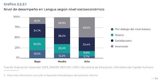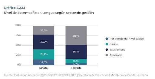 Tal vez uno de los datos más preocupantes sea la diferencia que se percibe en el desempeño de los estudiantes de escuelas privadas y públicas. Mirando los resultados de las pruebas de lengua se observa que en las escuelas de gestión estatal sólo el 22,2% de los estudiantes alcanzan un nivel avanzado, mientras que en las escuelas privadas lo hace el 48,1%. La desigualdad también aparece si se observa el corte por nivel socioeconómico: en los sectores bajos los niños y niñas que no alcanzan el nivel básico representan el 19,5%, mientras que en los sectores altos son solo el 5,7%.