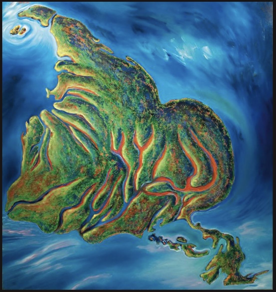 En la obra expuesta el querido Nicolás retoma un discurso olvidado de Joaquín Torres García. En un mapa atípico coloca arriba el sur de una Sud América verde surcada de sus grandes ríos. Metafóricamente (a mi ver) las Malvinas aparecen entrañablemente próximas al continente.