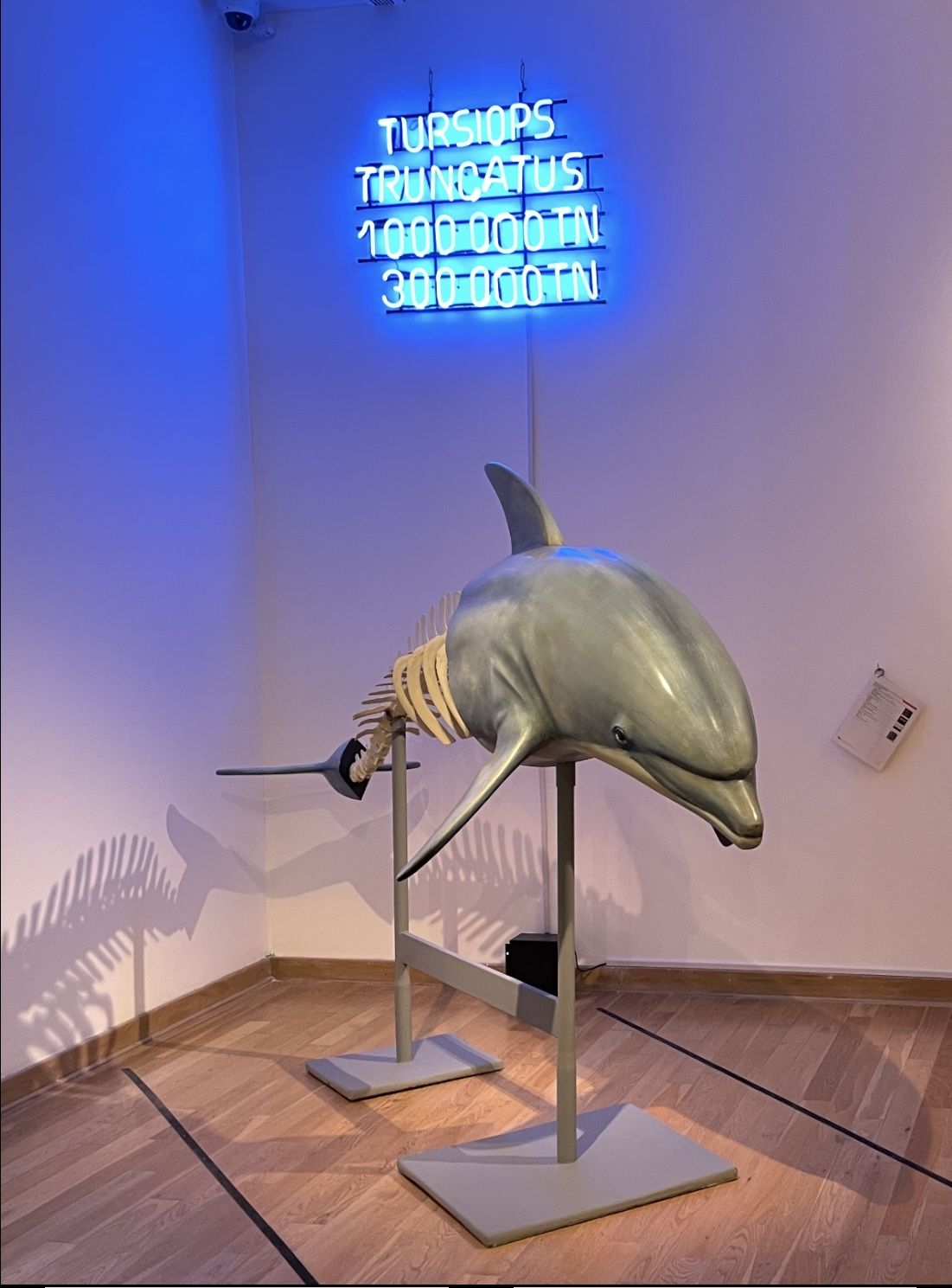 Para terminar “Tursiops Truncatus” de Luis Fernando Benedit (1937-2011) una escultura de 2008. Está realizada en fibra de vidrio con huesos de delfín y luces de neón. El título copia el nombre científico del cetáceo. El resto del texto (1.000.000 tn- 300.000 tn) alerta sobre el descarte pesquero y la captura incidental.