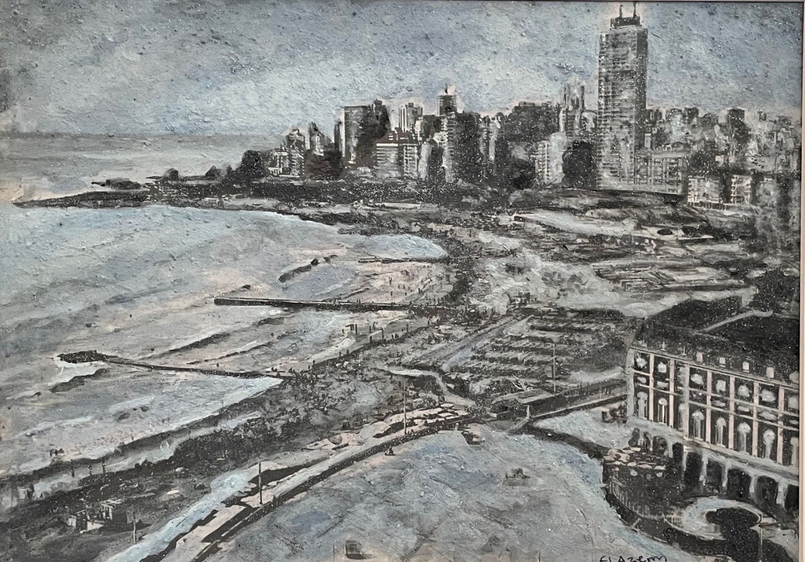 La obra de Karina El Azem, de un formato algo menor es una vista también aérea de la Bristol mirada de norte a sur. Se caracteriza por estar realizada con una pintura sensible a la humedad que varía la coloración en función de ella. Más allá de la validez del recurso y de la indudable calidad de la factura me interesa destacar una feliz coincidencia: En las últimas semanas las playas de Mar del Plata se han visto invadidas por un tipo de algas de coloración rojiza.