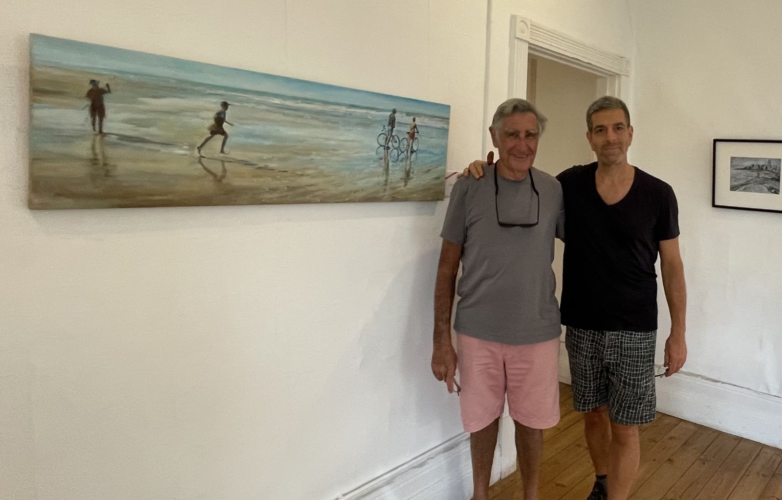 “Amar la mar” de Daniel Kaplan en cambio ofrece una vista de una playa del sur de la ciudad en el clásico formato apaisado que caracteriza al artista. La armonía de la paleta, la composición de la escena que incluye cuatro adolescentes con sus reflejos y un mar calmo que se extiende hacia un horizonte alto completan una pintura apacible de finísima sensibilidad con un profundo sentido poético.