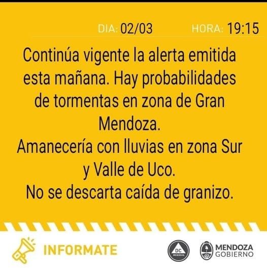 Según detallaron, “hay probabilidades de tormentas en zona de Gran Mendoza. Amanecería con lluvias en zona sur y Valle de Uco”.