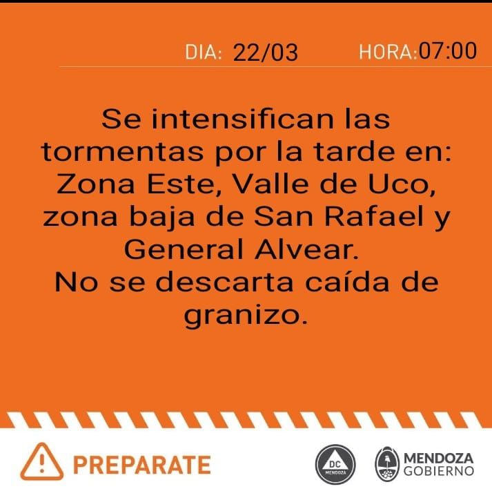 Defensa Civil y el Servicio Meteorológico Nacional mantienen activas alertas para toda la provincia por tormentas. Para la tarde habrá alerta amarilla en todo el llano y en la noche se elevará a naranja en el Valle de Uco, la zona Este y General Alvear y San Rafael.
