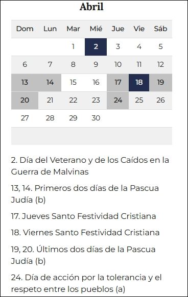 - Miércoles 2: Día del Veterano y de los Caídos en la Guerra de Malvinas (inamovible).