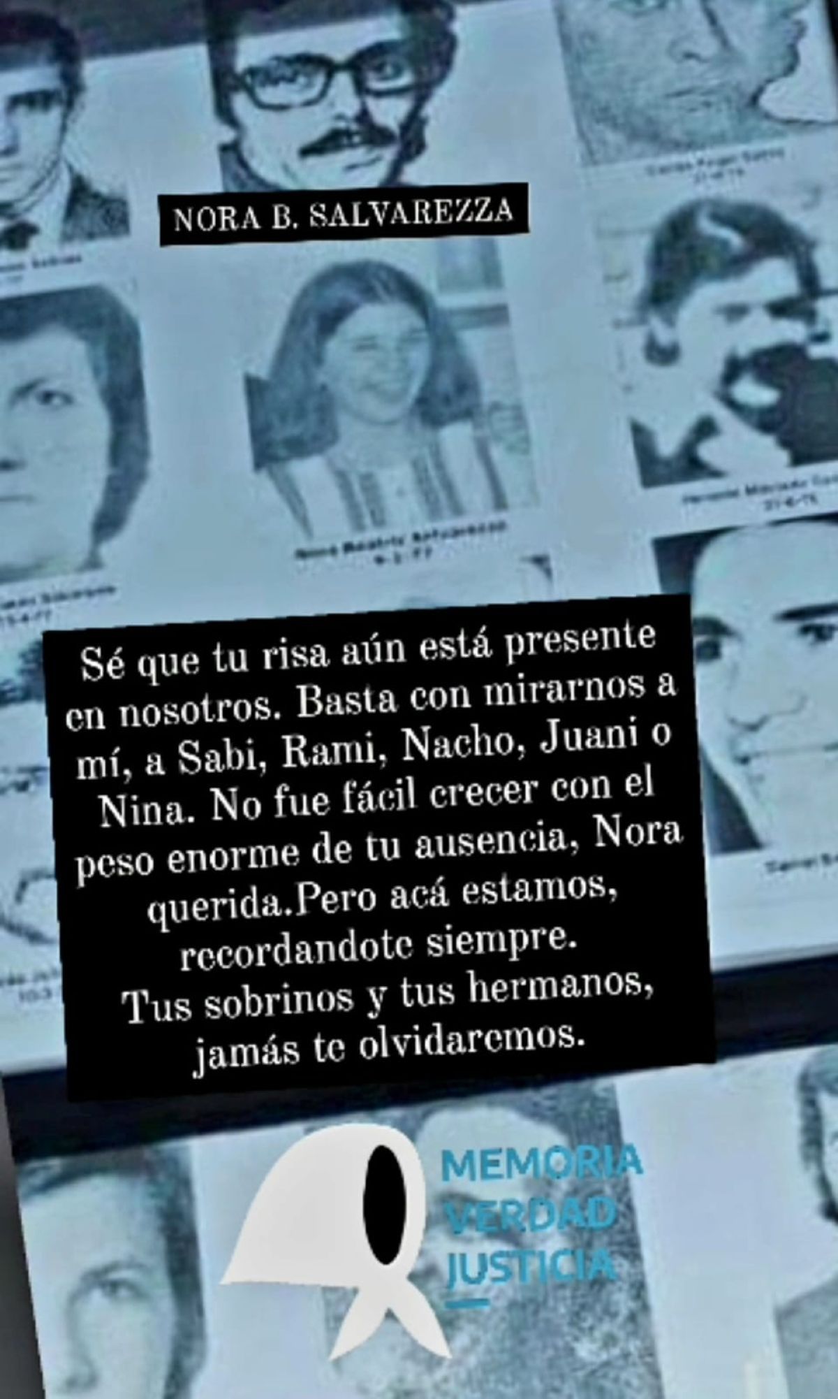 En 2023, S.S pudo entrar por primera vez a la ex ESMA, donde encontró una foto de su hermana. "Anda, ahí la vas a encontrar", le dijo su sobrino. En 2024, con el cierre de su caso, sintió que se hizo justicia: "Cuando escuché el alegato del fiscal, algo en mí se pacificó. Esa sensación de decir: 'Acá está, se hizo justicia'".